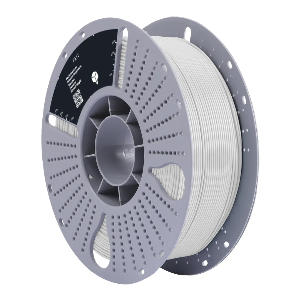 PA12 (Polyamide 12 / Nylon 12) filament is an advanced engineering material offering outstanding flexibility, chemical resistance, and lower moisture absorption compared to other nylons. It produces durable, fatigue-resistant parts with a smooth surface finish, making it well-suited for snap-fits, cable management, and demanding functional applications. PA12 is easier to print than PA6 due to its reduced hygroscopicity, though dry storage is still recommended.